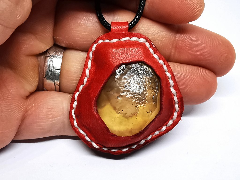 ostatní materiál: kůže + voskovaná šňůrka 45 cm s kovovým nastavením 5 cm. Pouzdro má z obou stran otevřený pohled, díky kterému lze vidět krásný průsvit samotného kamene.