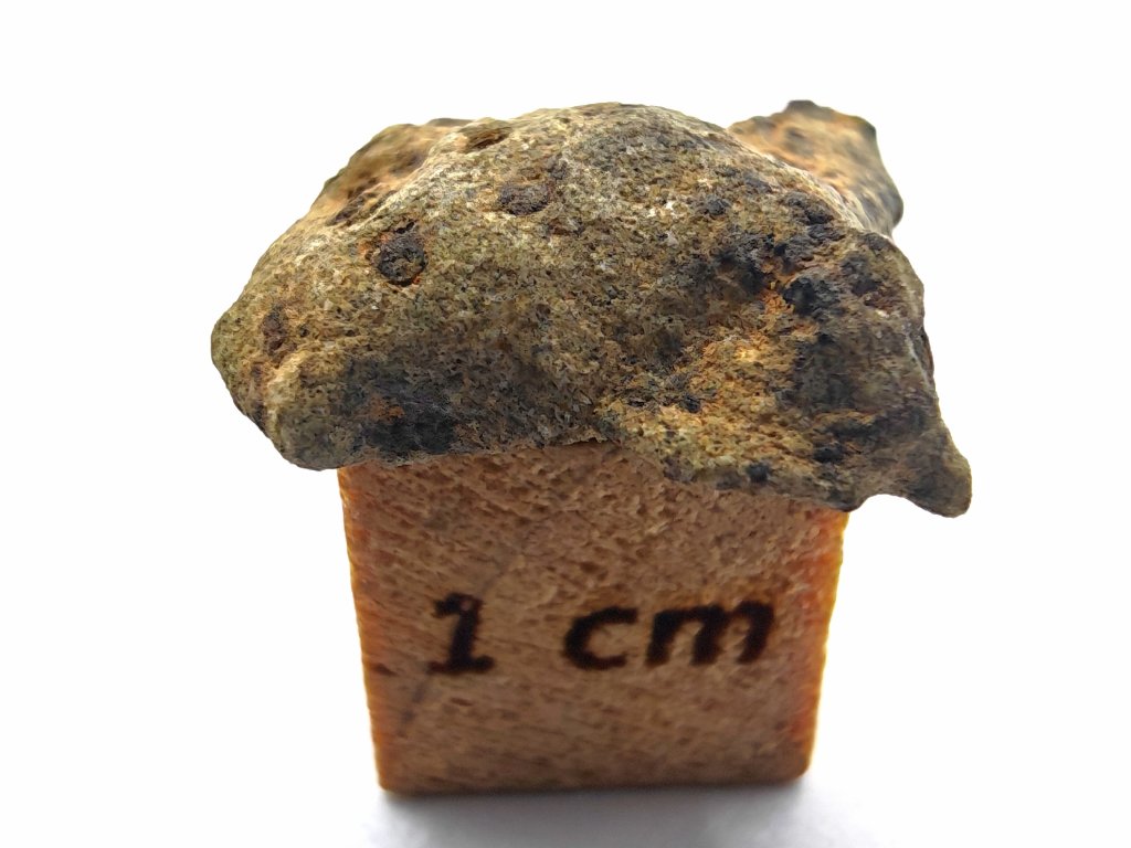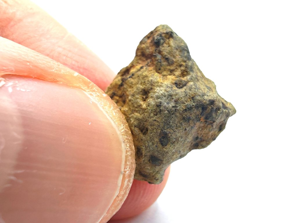 Fyzikální vlastnosti : Celková sebraná hmotnost byla přibližně 2 kg. Vzorky usazenin vykazují vnější povrch částečně pokrytý tmavou, mírně odřenou krustou z tavení. Povrch řezaný pilou odhaluje mnoho charakteristických milimetrových hnědozelených fenokrystalů olivínu zasazených do světle hnědožluté, jemnozrnné základní hmoty.