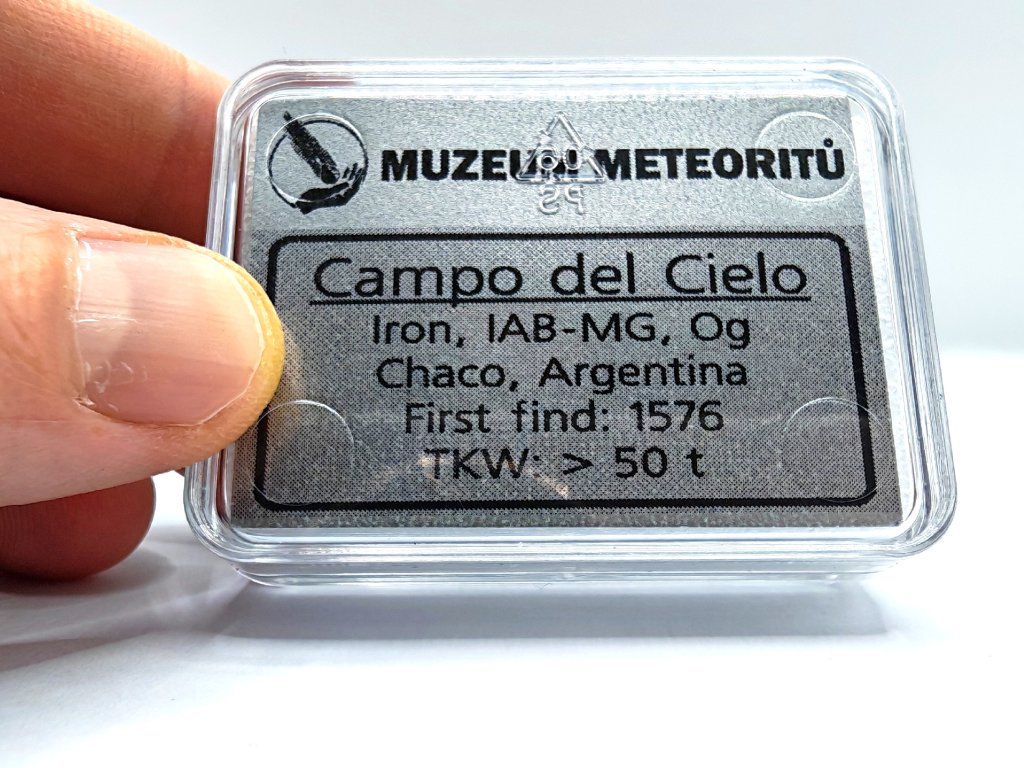 Meteorit v průhledné krabičce s popiskem, certifikátem pravosti, ukázkou analýzy složení a brožurkou s informacemi.