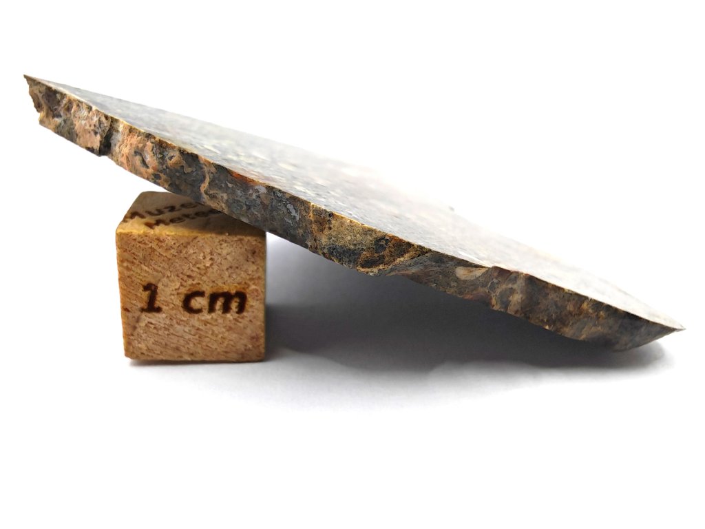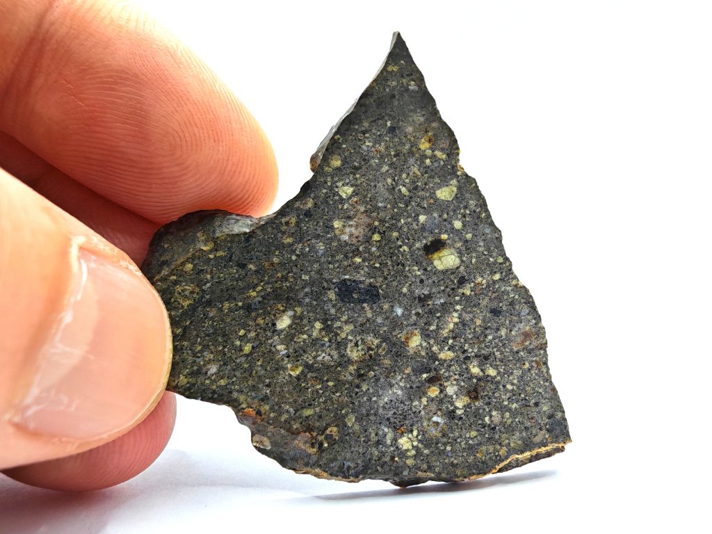 Fyzikální vlastnosti : Šedavá hornina částečně pokrytá tavnou kůrou.