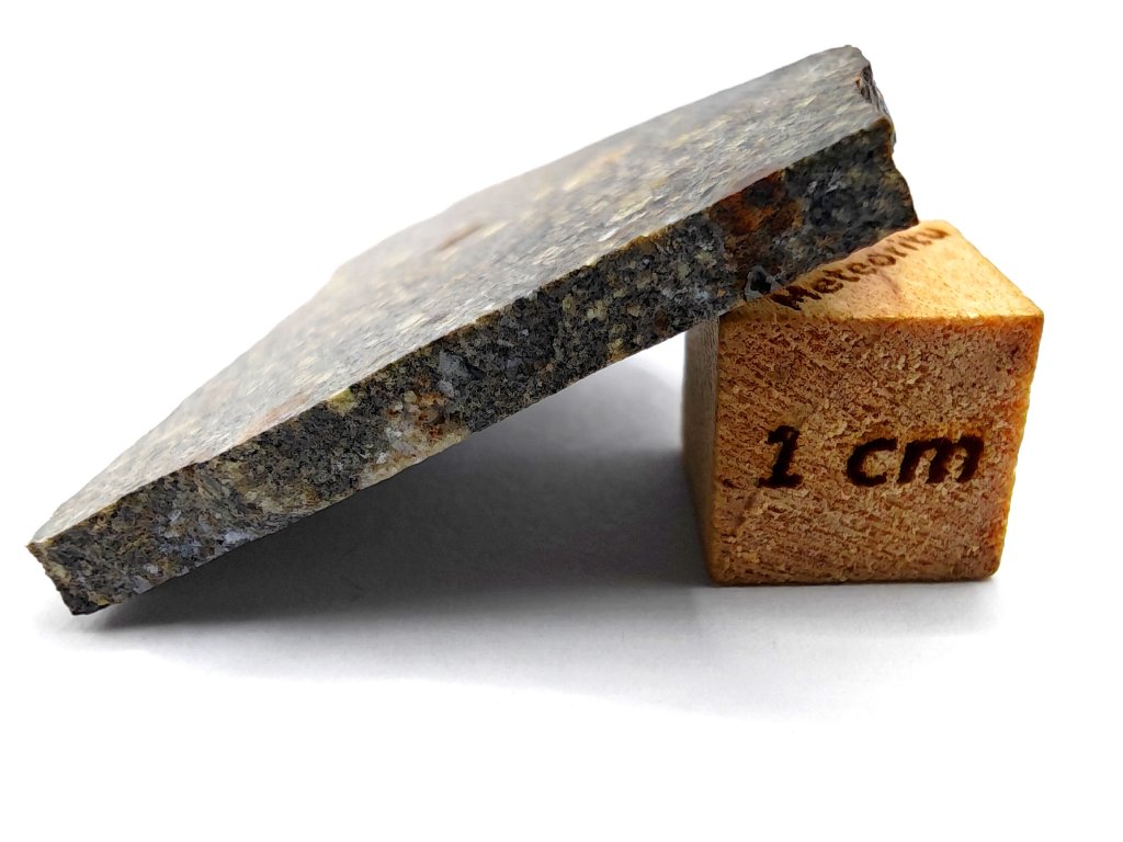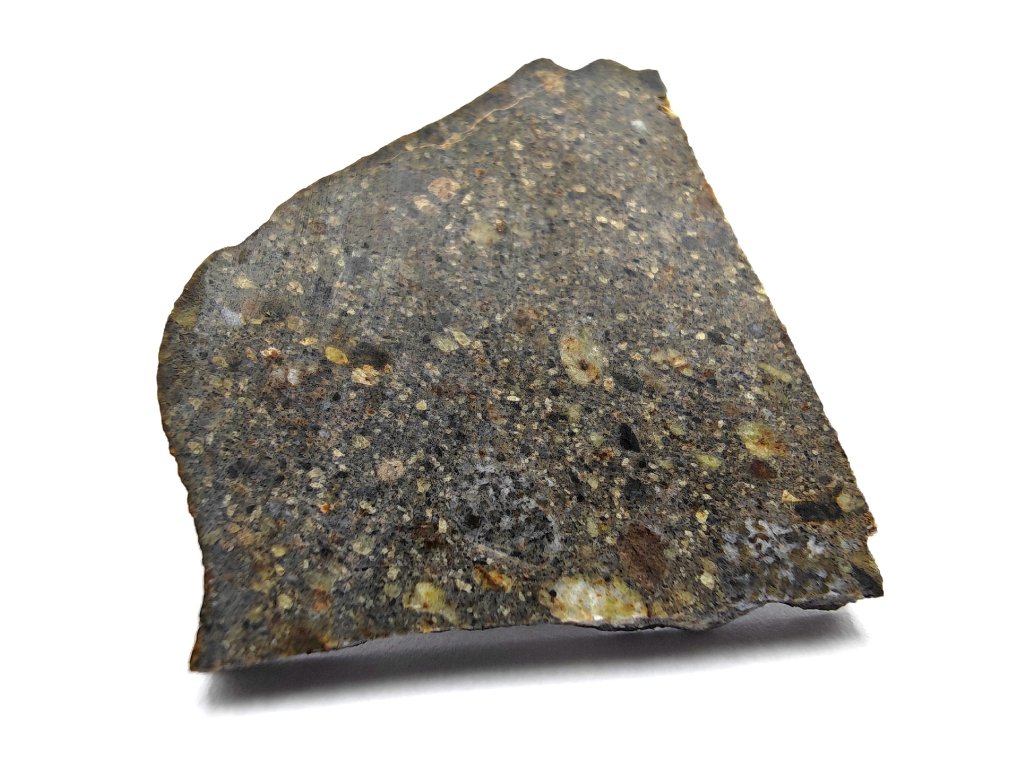 Fyzikální vlastnosti : Šedavá hornina částečně pokrytá tavnou kůrou.