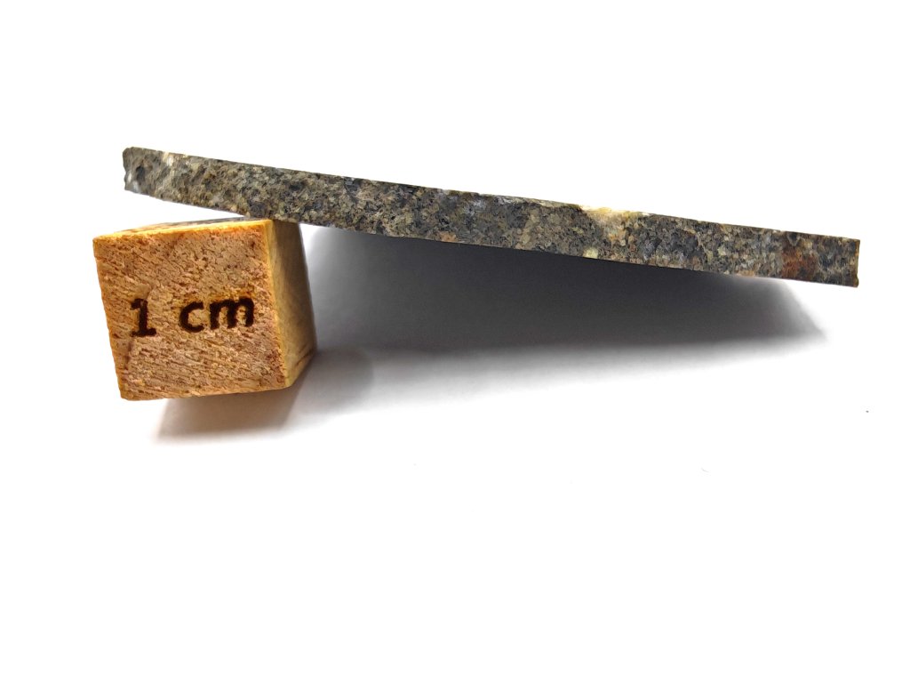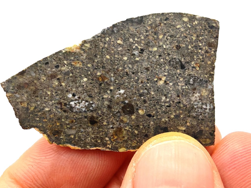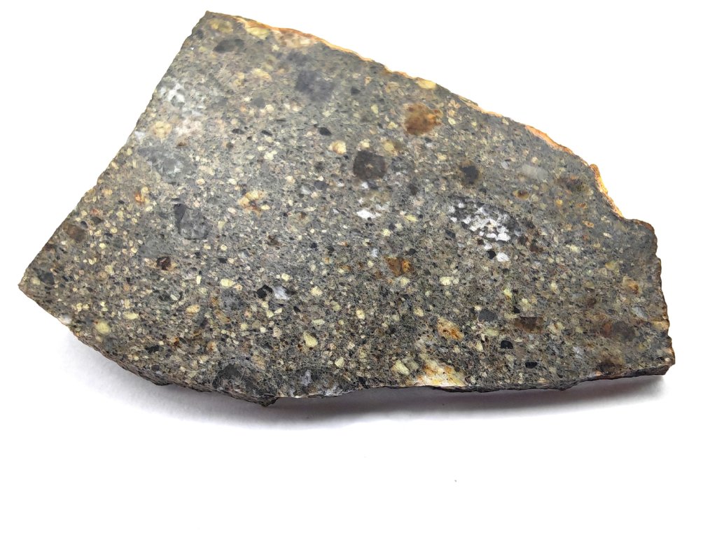 Fyzikální vlastnosti : Šedavá hornina částečně pokrytá tavnou kůrou.