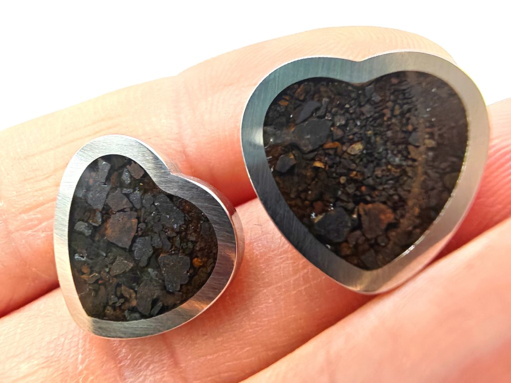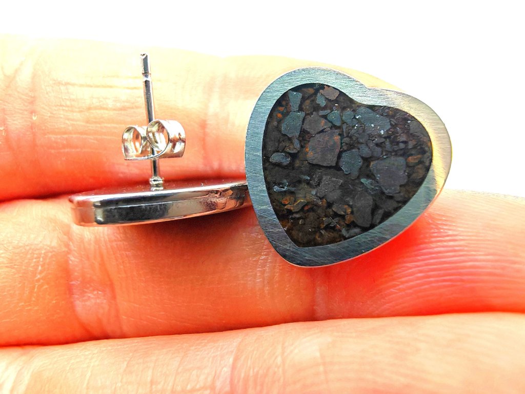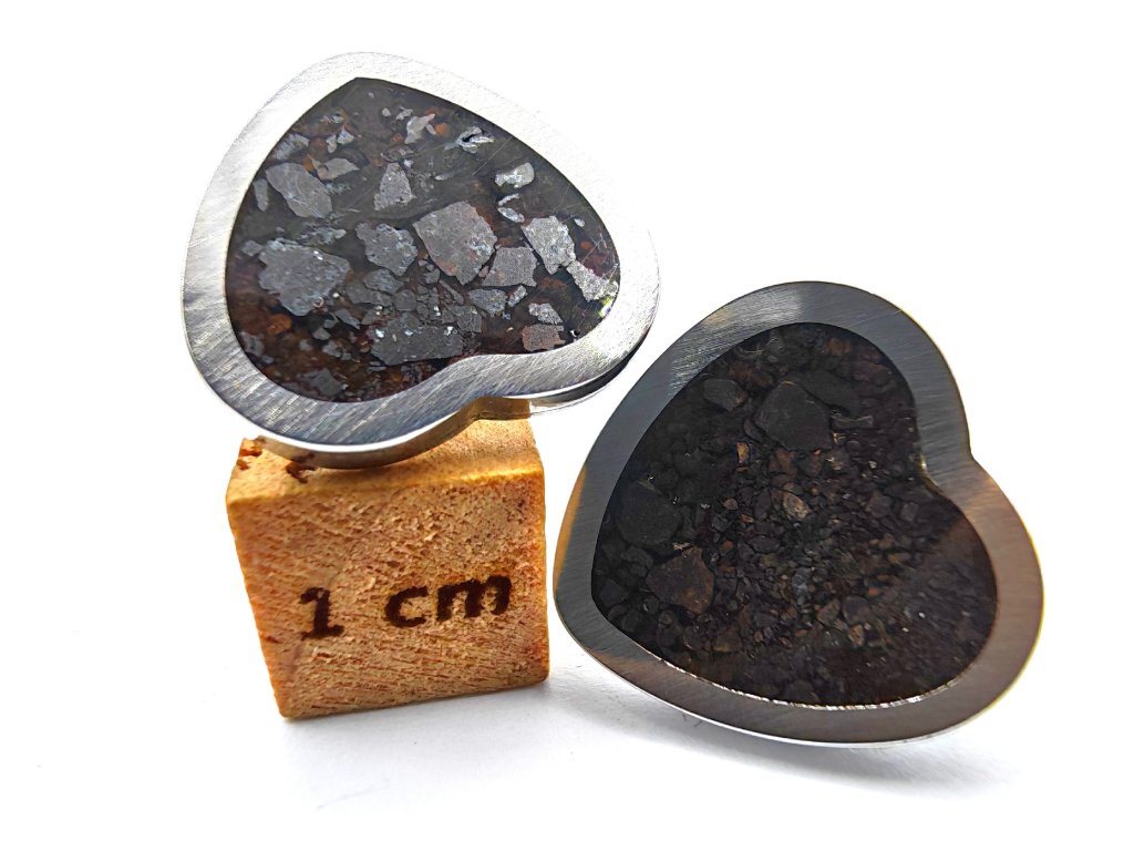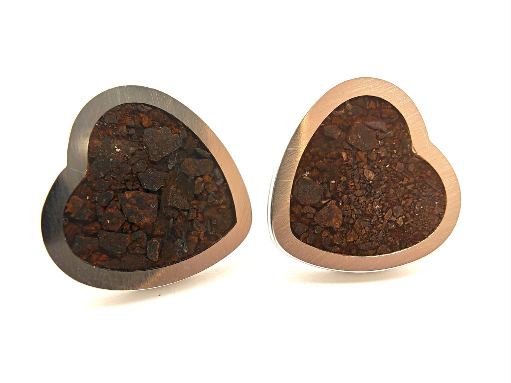 Kamenný meteorit starý 4,5 miliardy let, rozebraný do poslední chondry (částečky) a umístěný do náušnic.