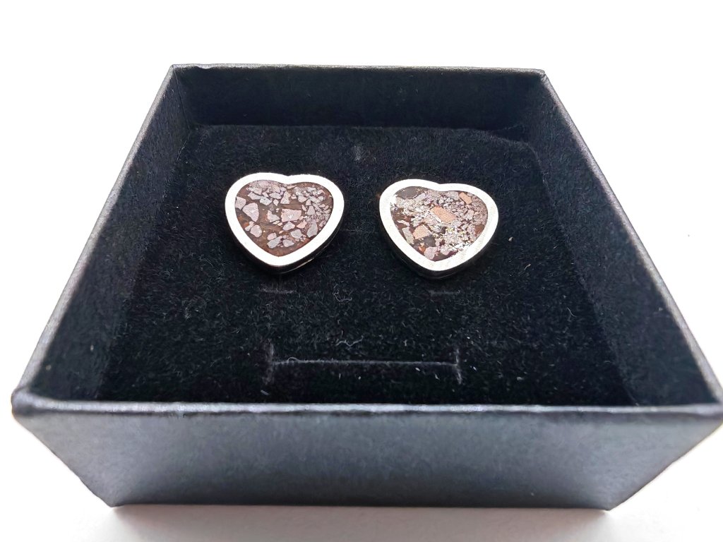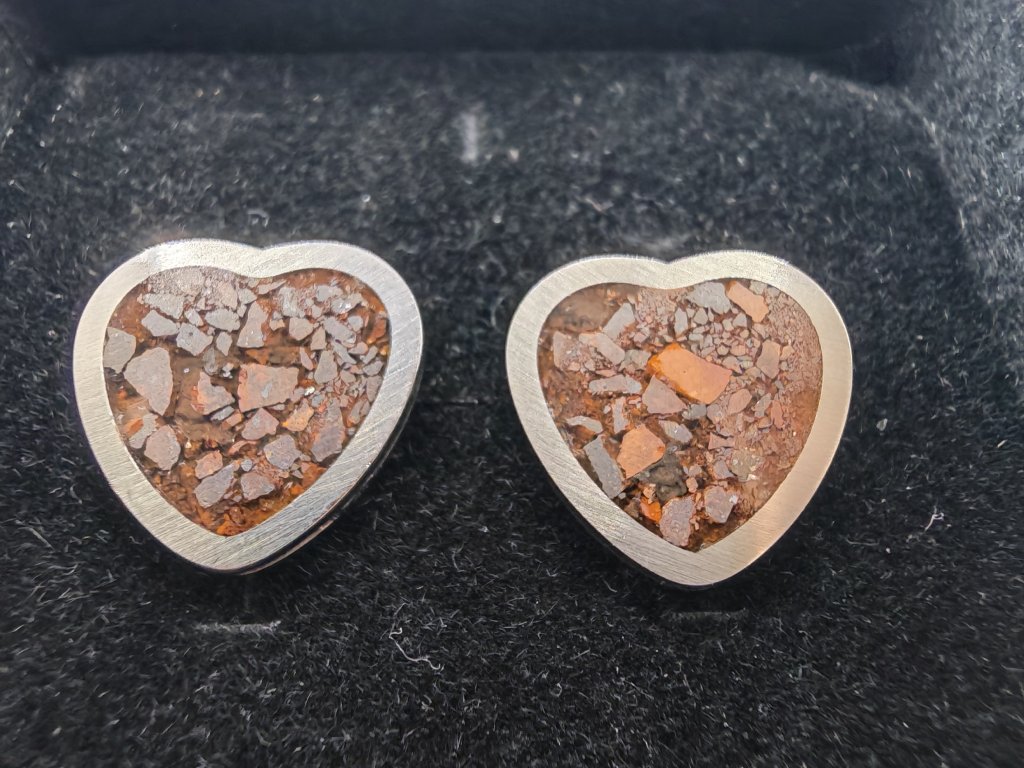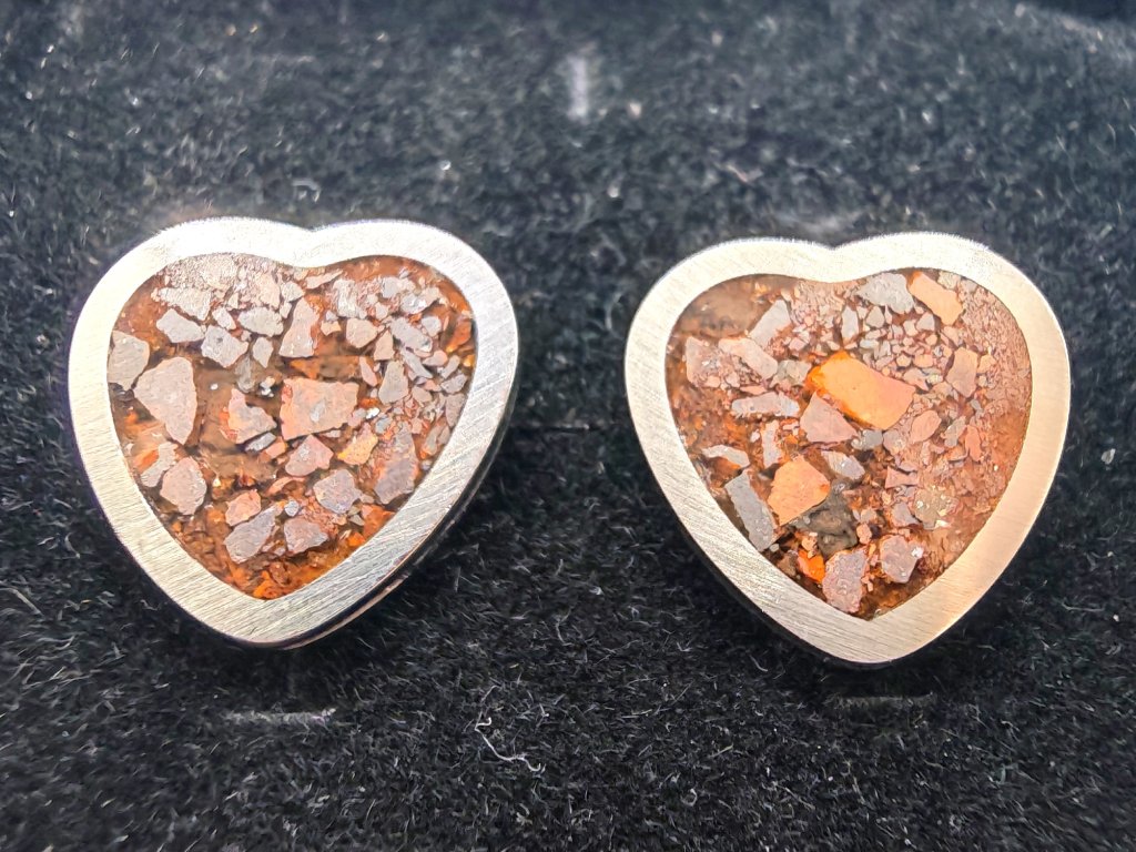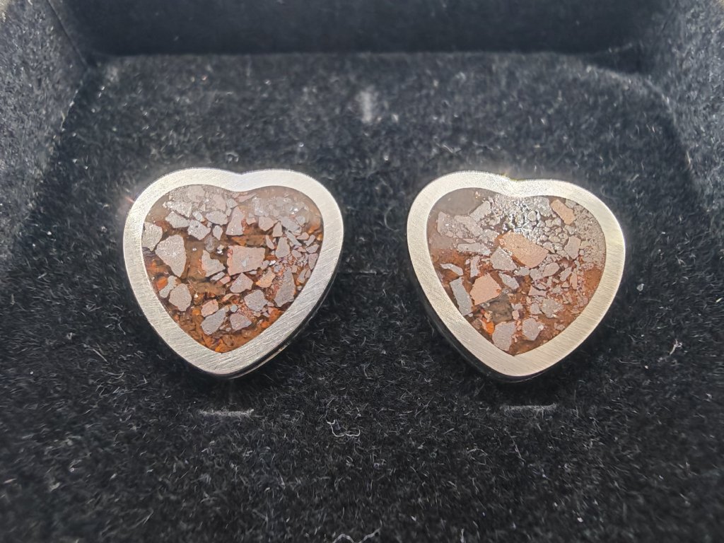 Kamenný meteorit starý 4,5 miliardy let, rozebraný do poslední chondry (částečky) a umístěný do náušnic.