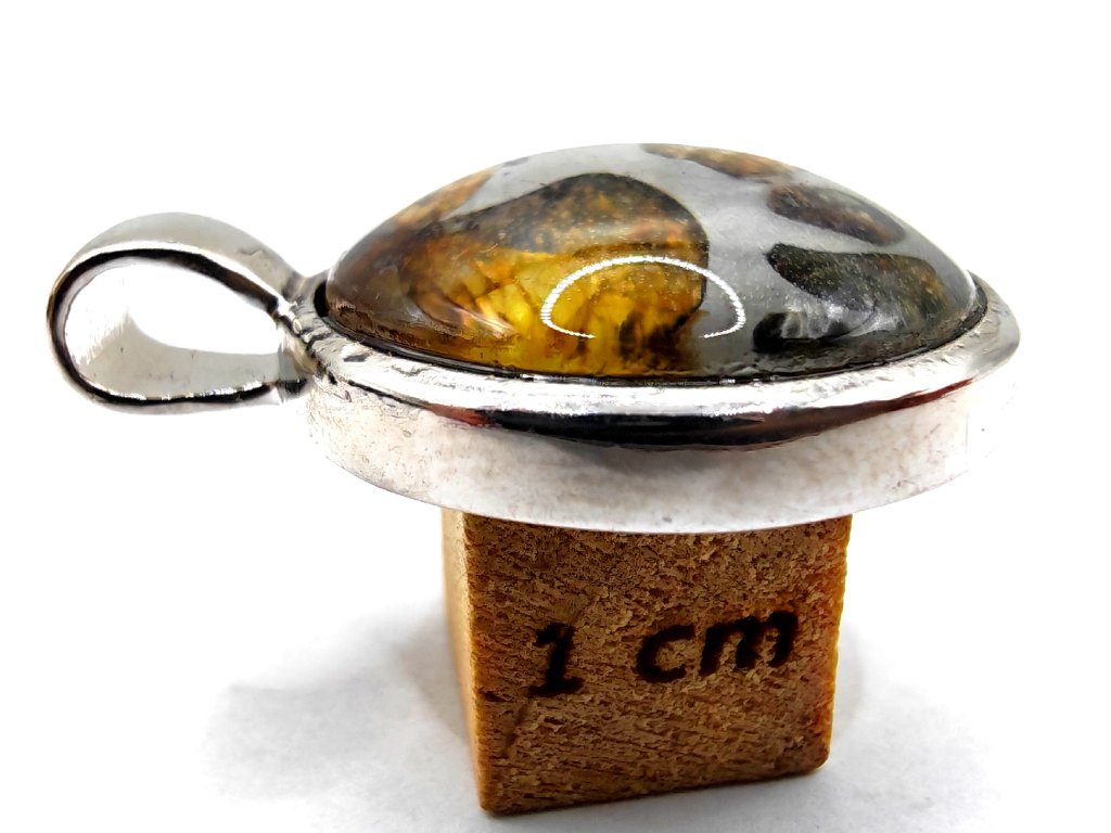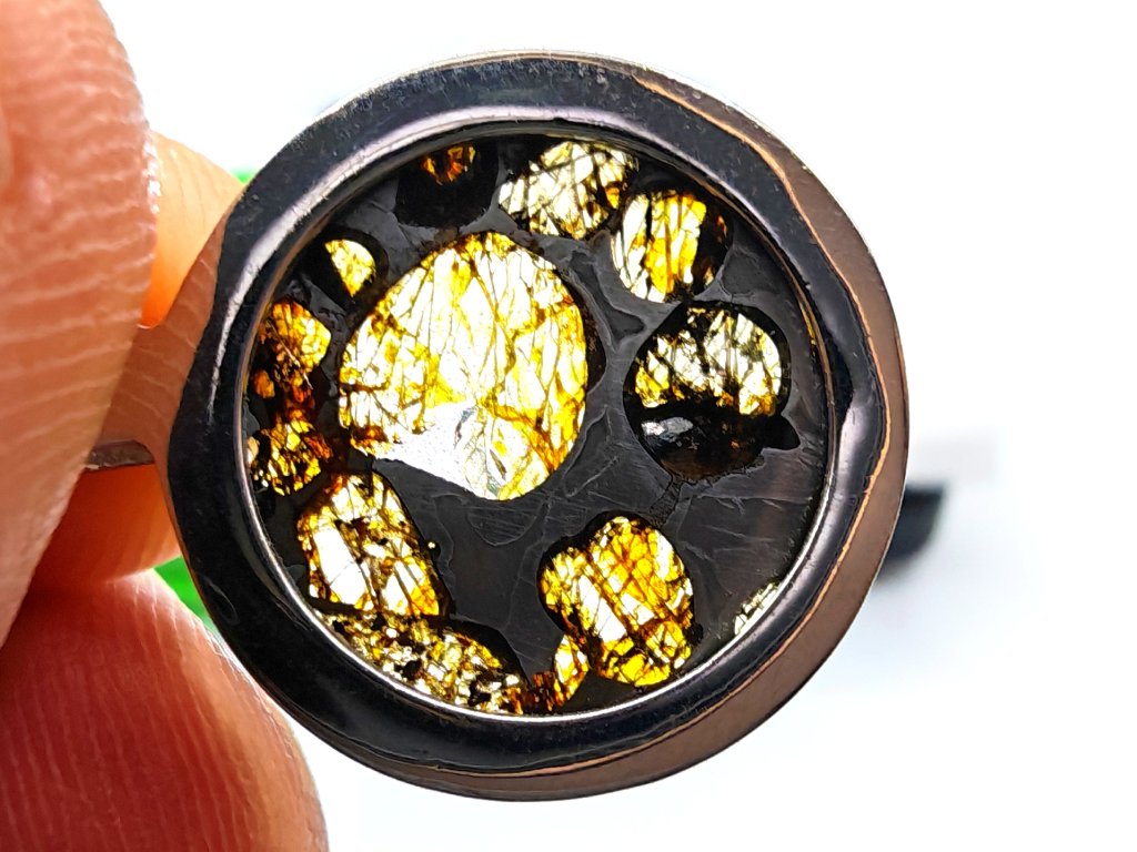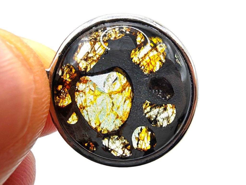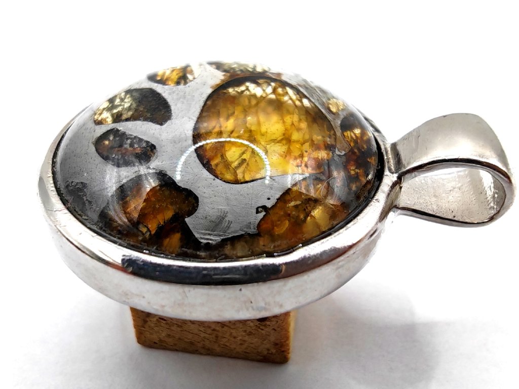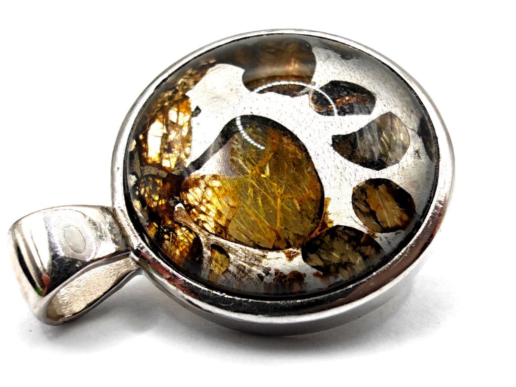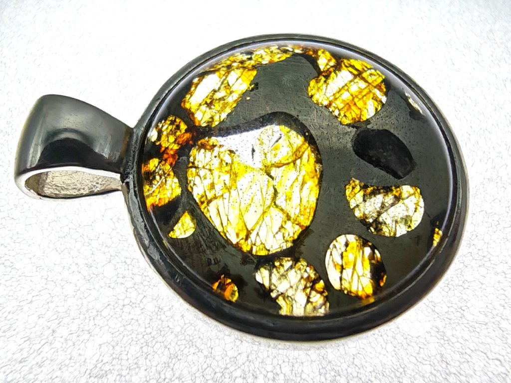 TOP PRODUKT! Plátek krásně průsvitného meteoritu Pallasitu v přívěsku, schovaný pod vrstvou tvrzeného skla.