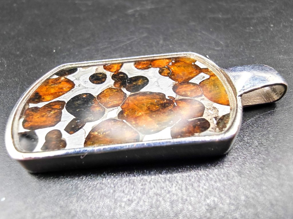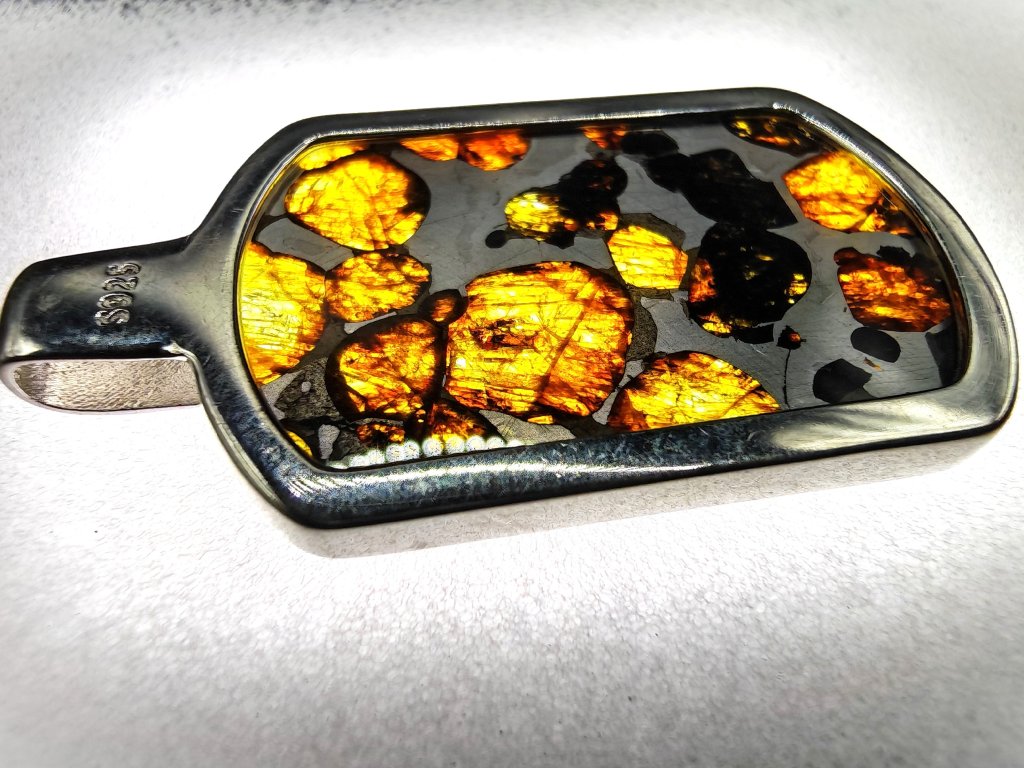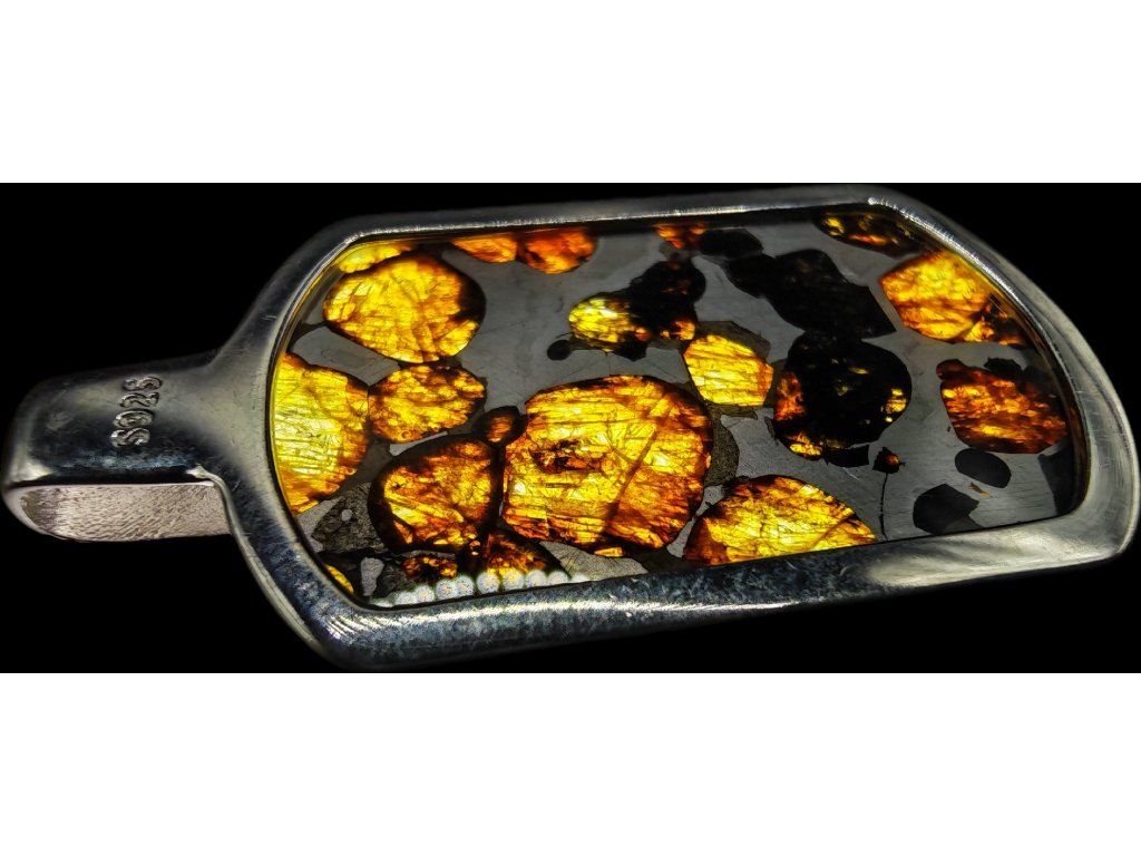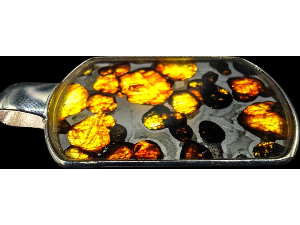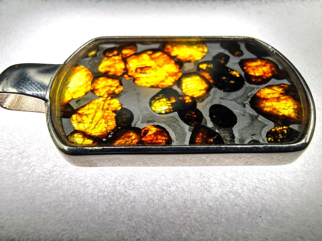 TOP PRODUKT! Plátek krásně průsvitného meteoritu Pallasitu v přívěsku, schovaný pod vrstvou tvrzeného skla.