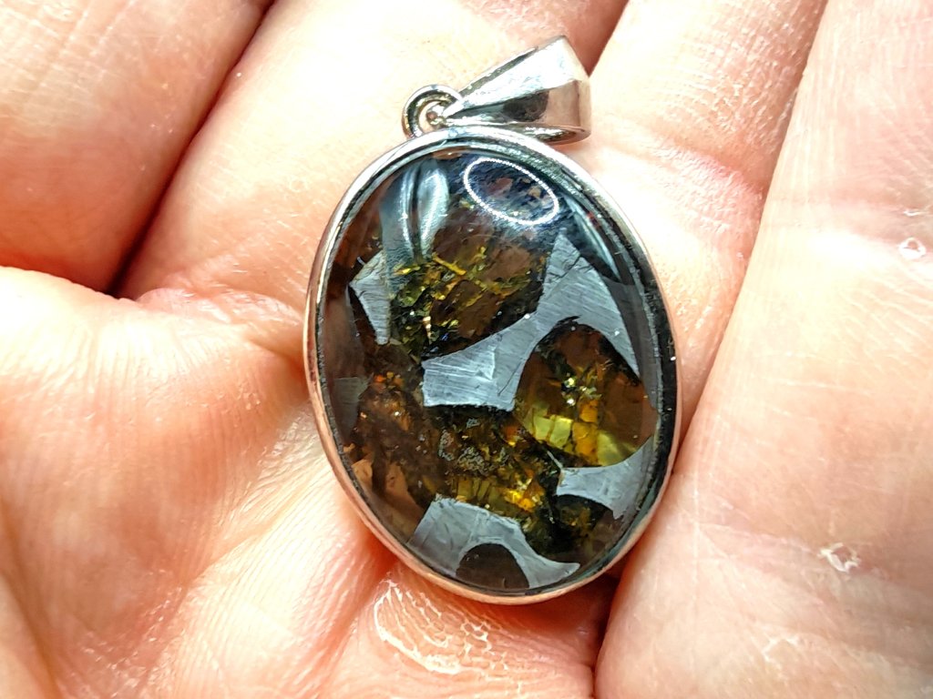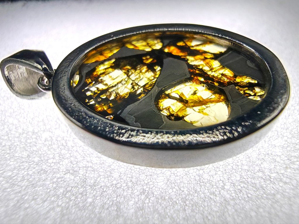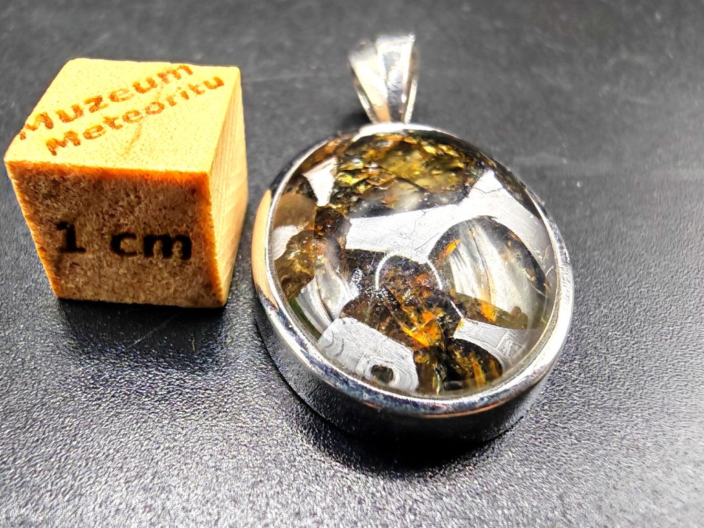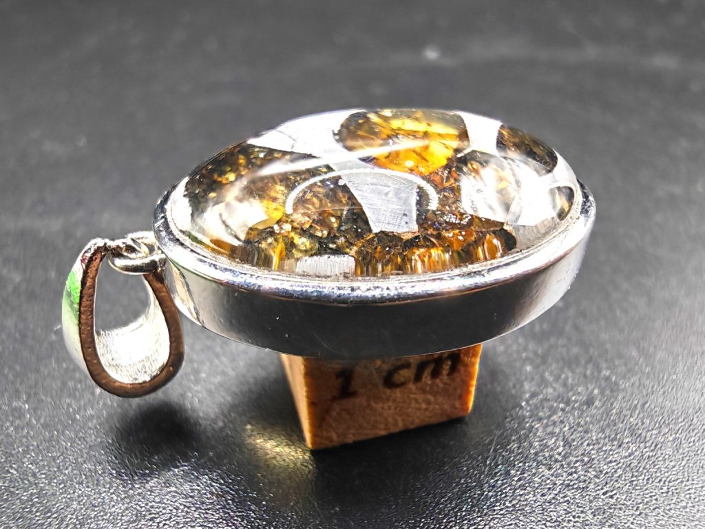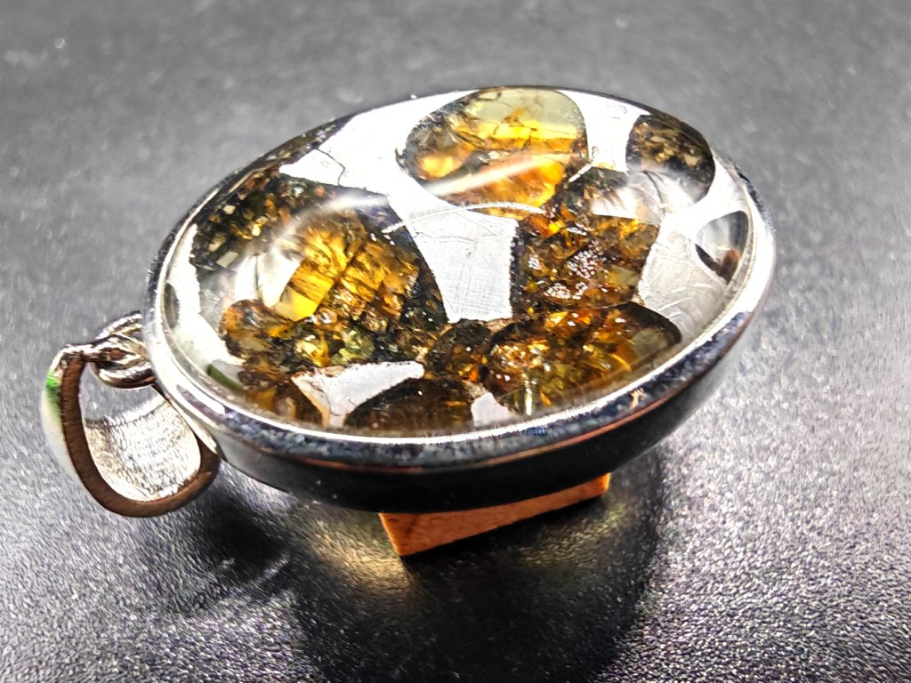TOP PRODUKT! Plátek krásně průsvitného meteoritu Pallasitu v přívěsku pod vrstvou tvrzeného skla.