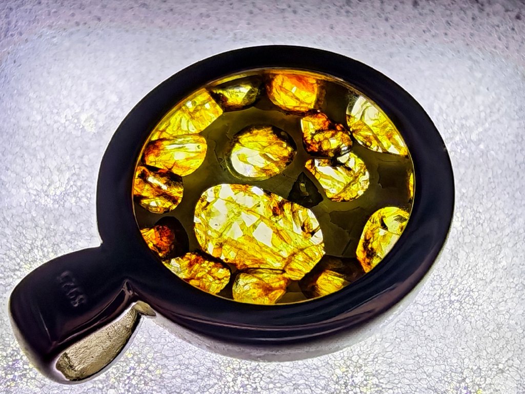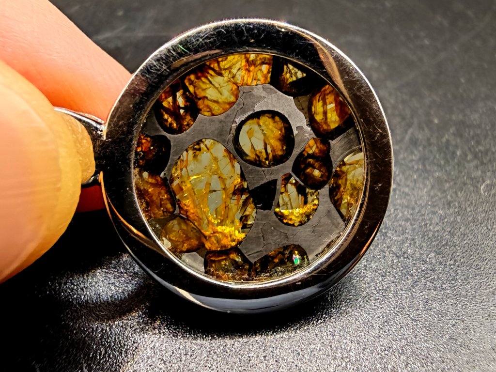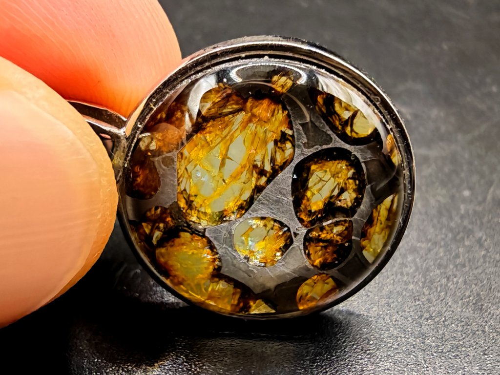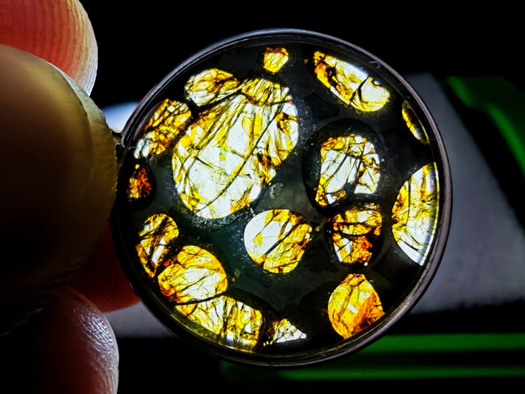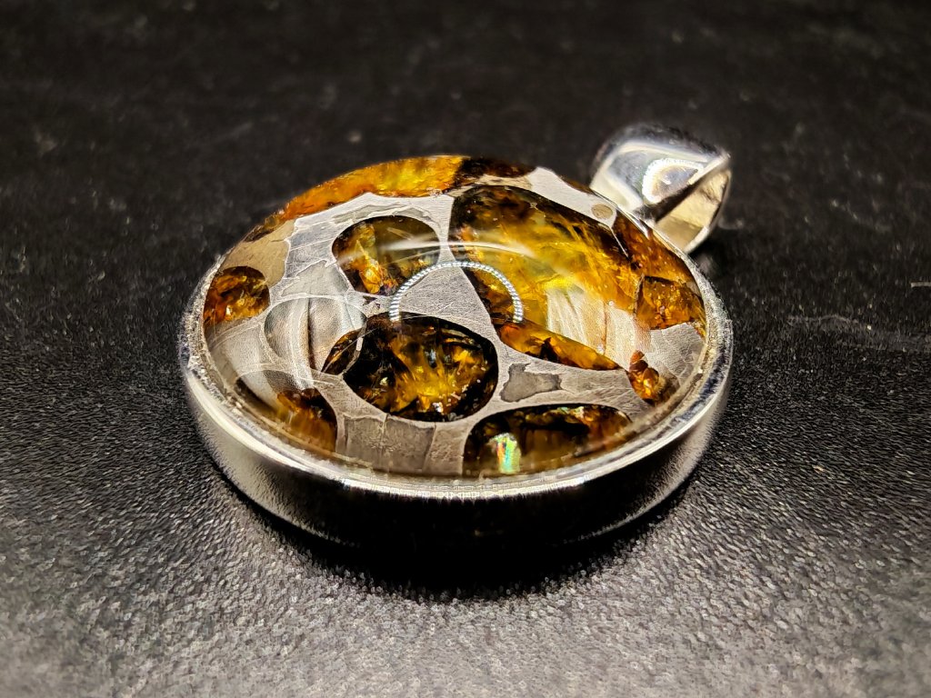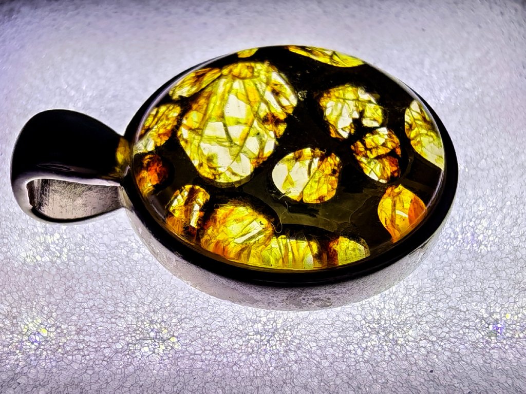 TOP PRODUKT! Plátek krásně průsvitného meteoritu Pallasitu v přívěsku, schovaný pod vrstvou tvrzeného skla.