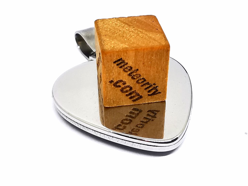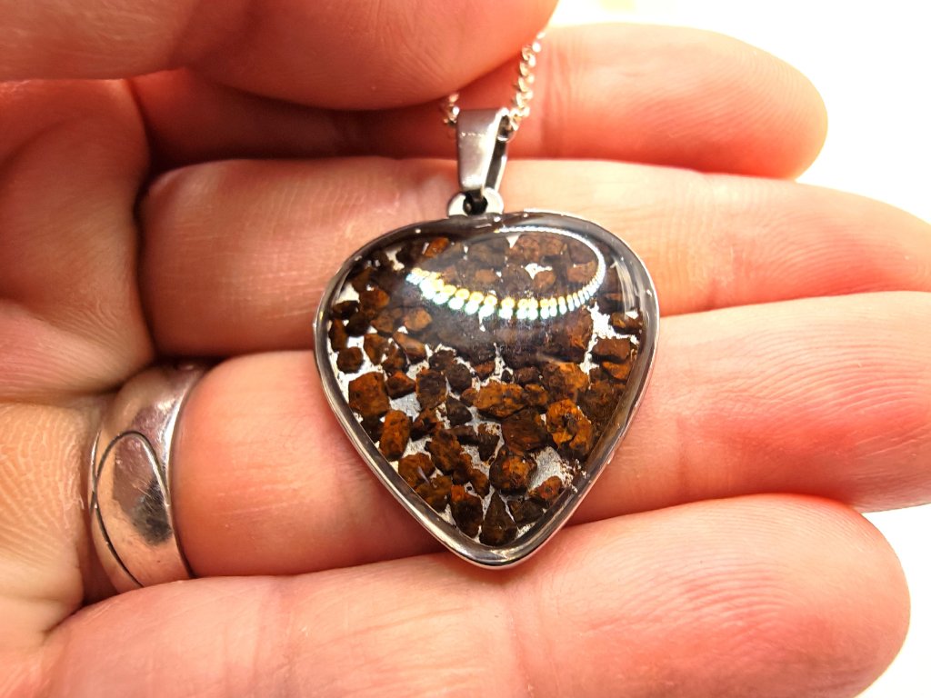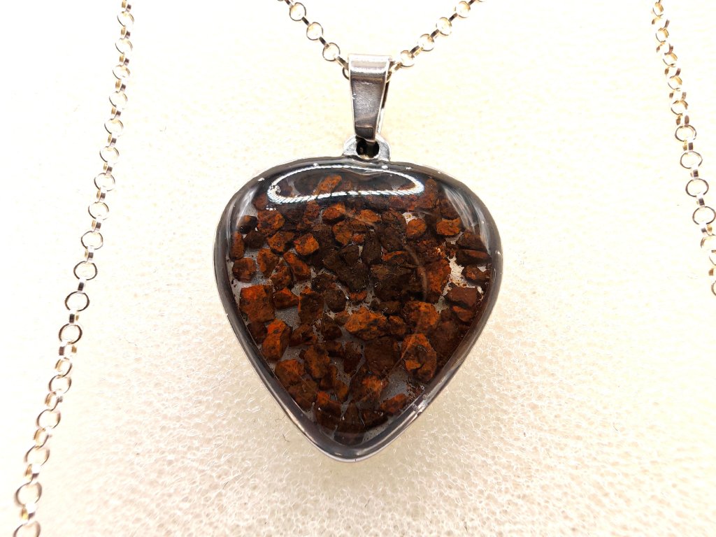 Kamenný meteorit starý 4,5 miliardy let, rozebraný do poslední chondry (částečky) a pečlivě složený do přívěsku ve tvaru srdce.