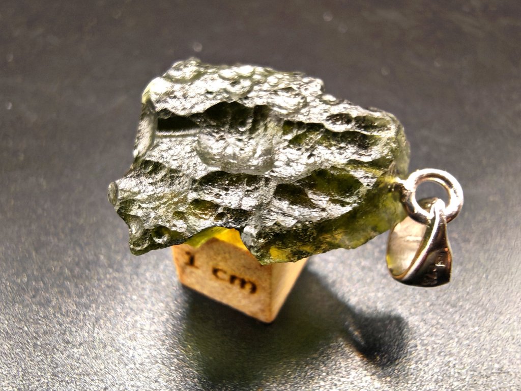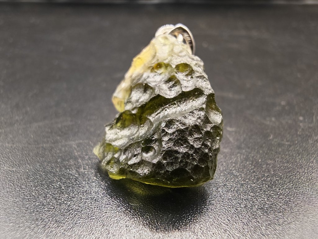 Kámen je surový a nijak neopracovaný. Je opatřen stříbrným očkem pro zavěšení na řetízek. Stříbro opatřeno českým státním puncem.